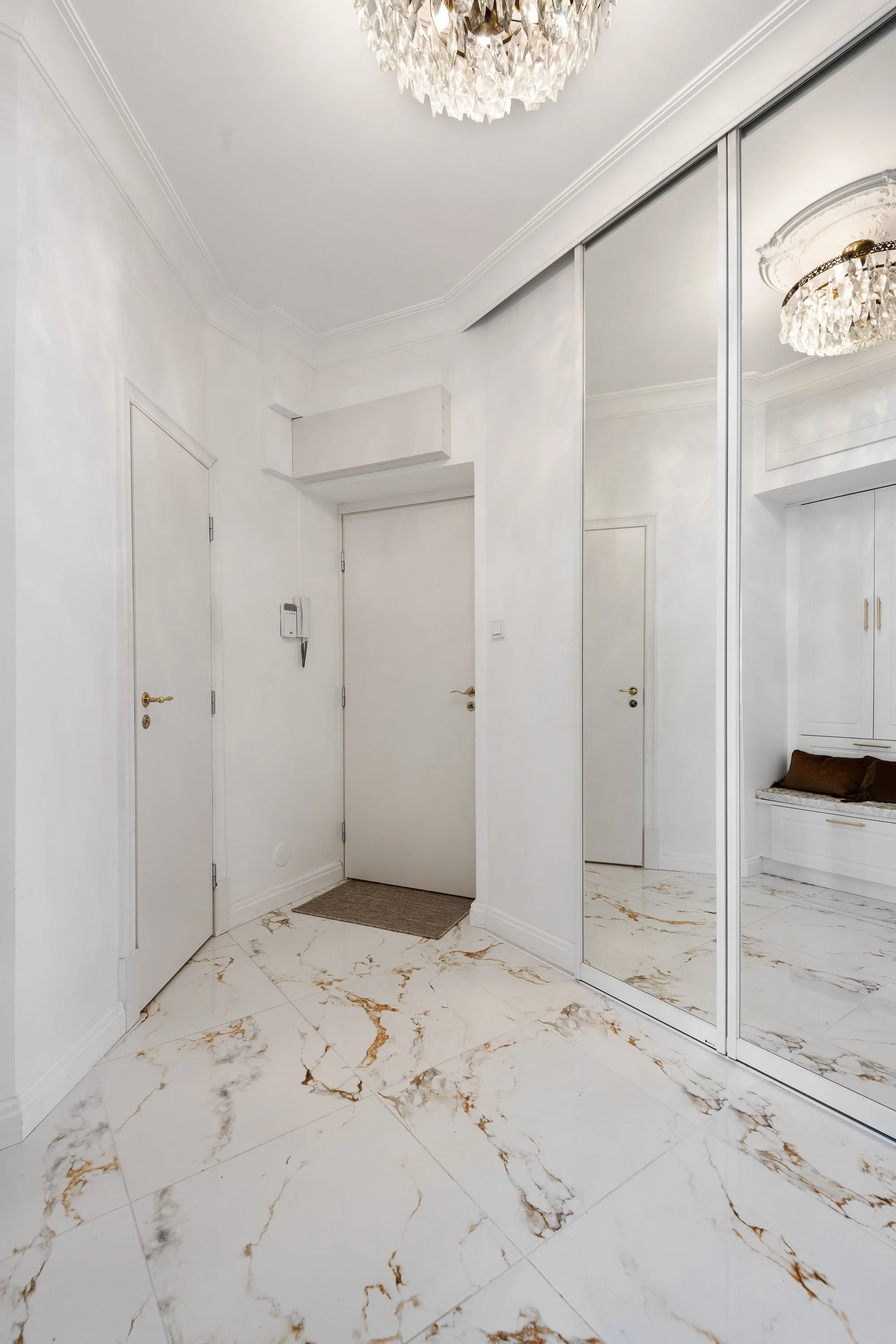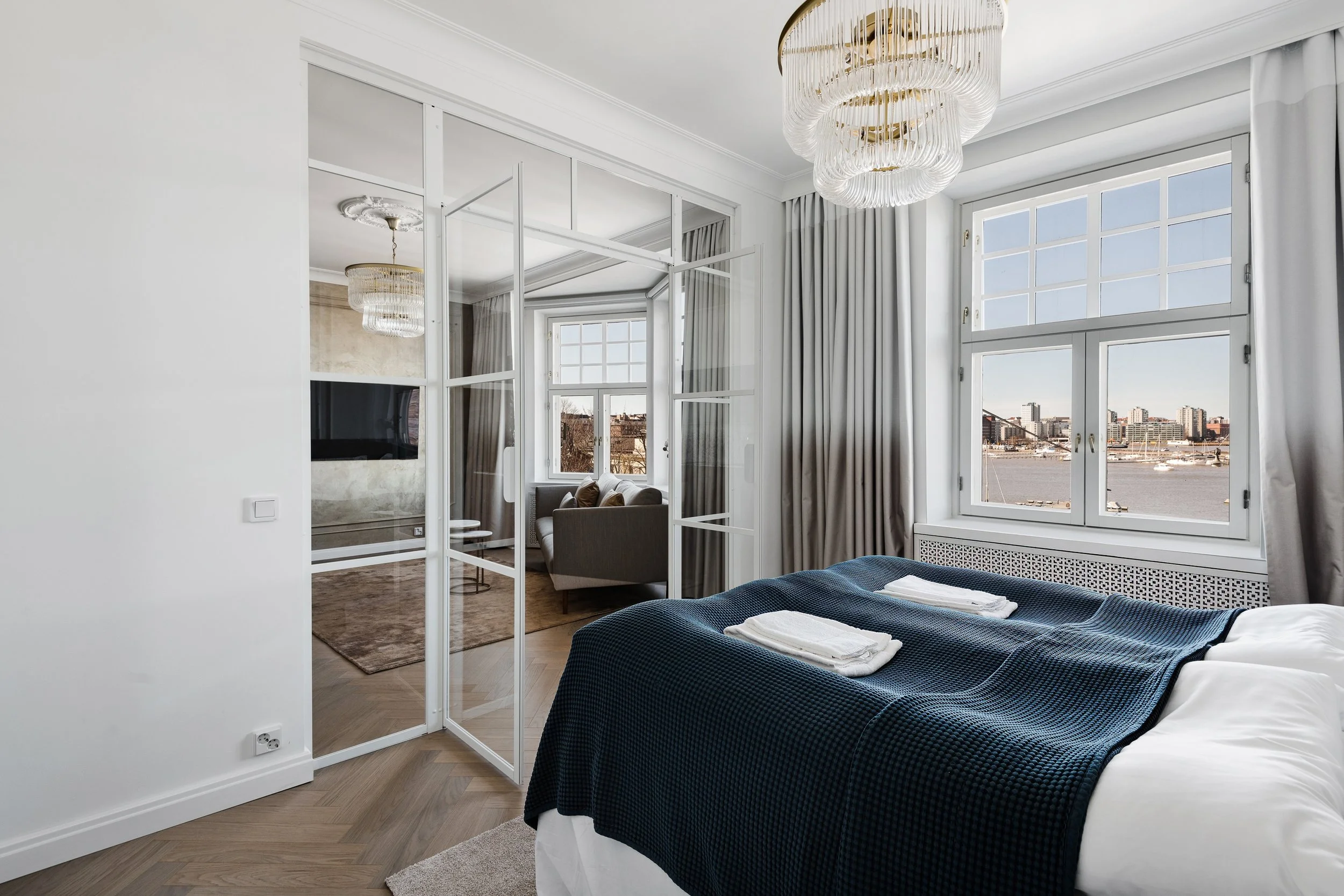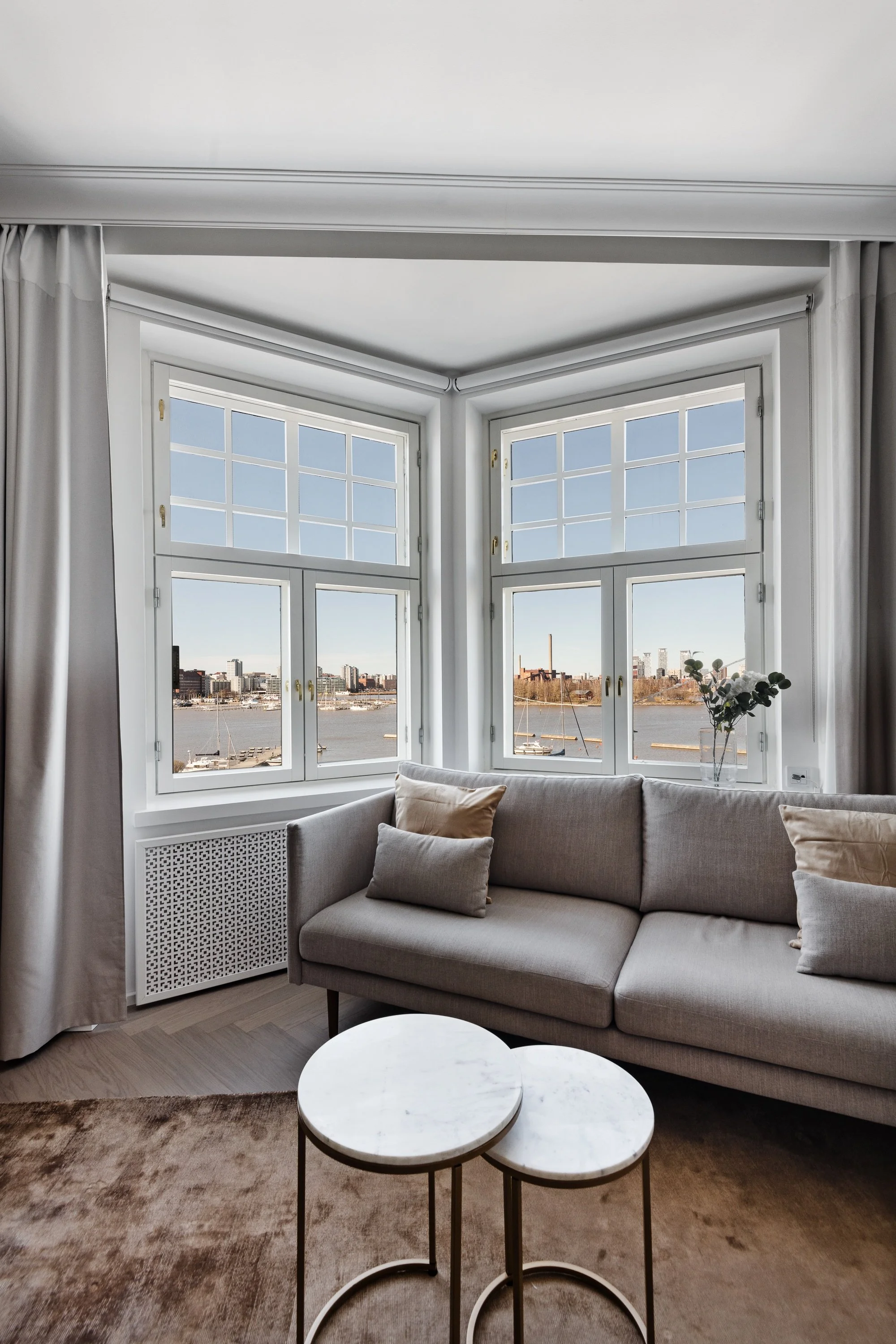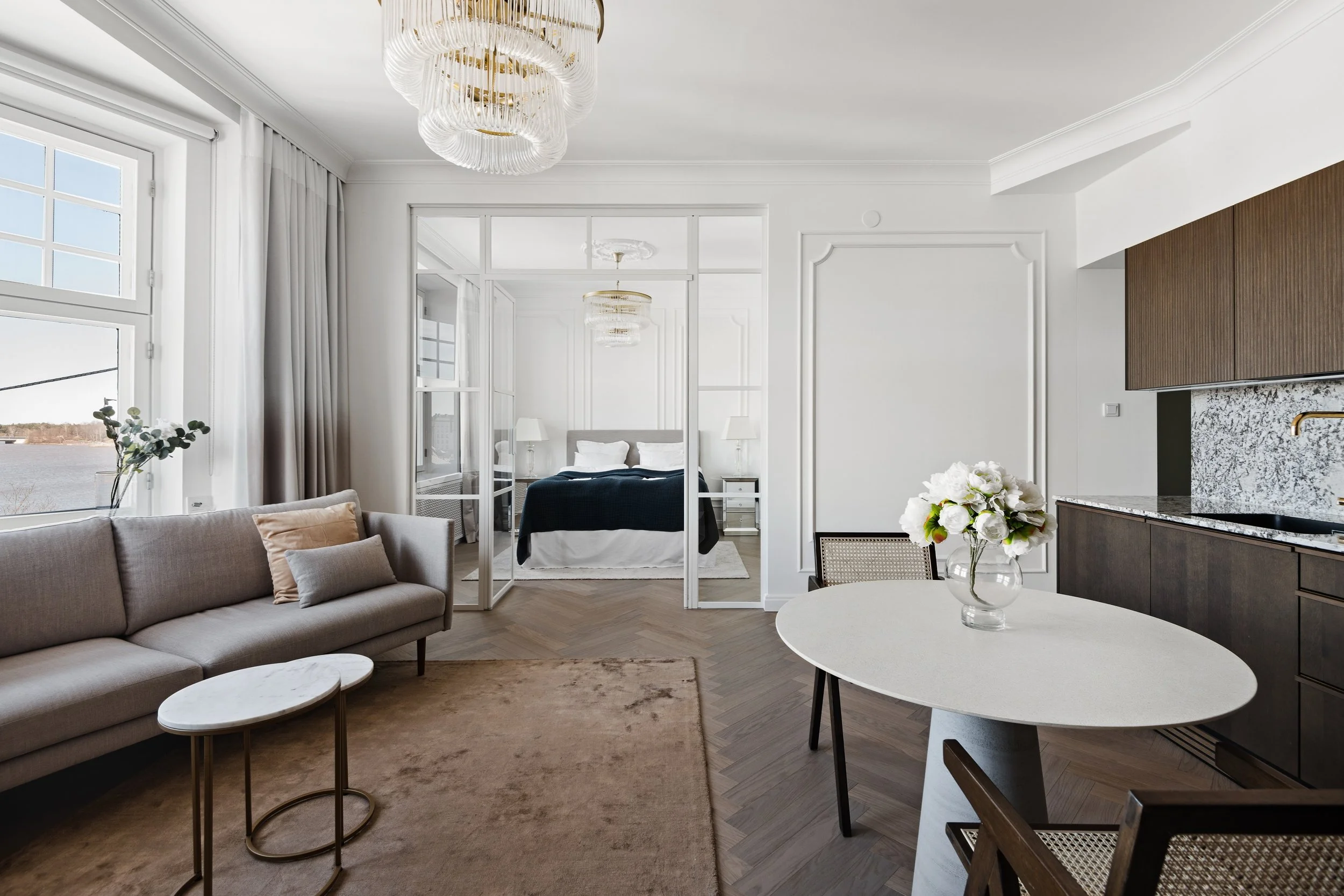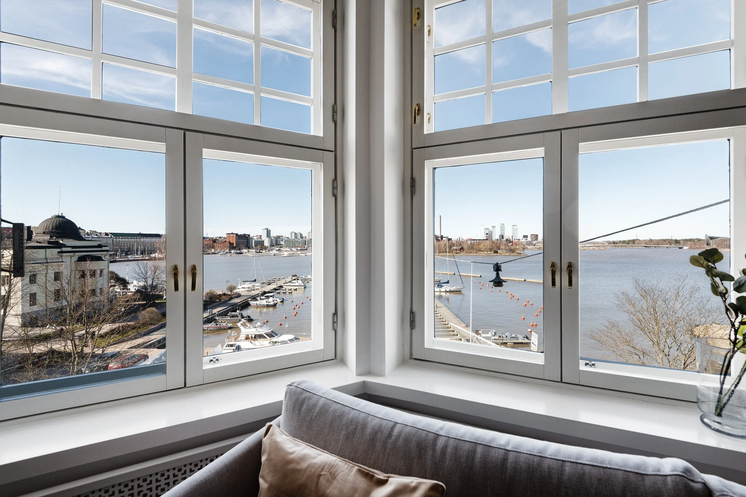 We are looking for tenants for a flexible time period to this superb location shoreside fully equipped and according to the photos furnished 1BR apartment in Katajanokka Helsinki. The apartment has been renovated completely. The luxurious marble flooring, interior designed in detail and the glimmering sea view is an unique combination. The grocery store and tram stop is located close by. Own dishwasher, dryer and a washing machine inside apartment, a common laundry with larger machines downstairs. The building has an elevator.